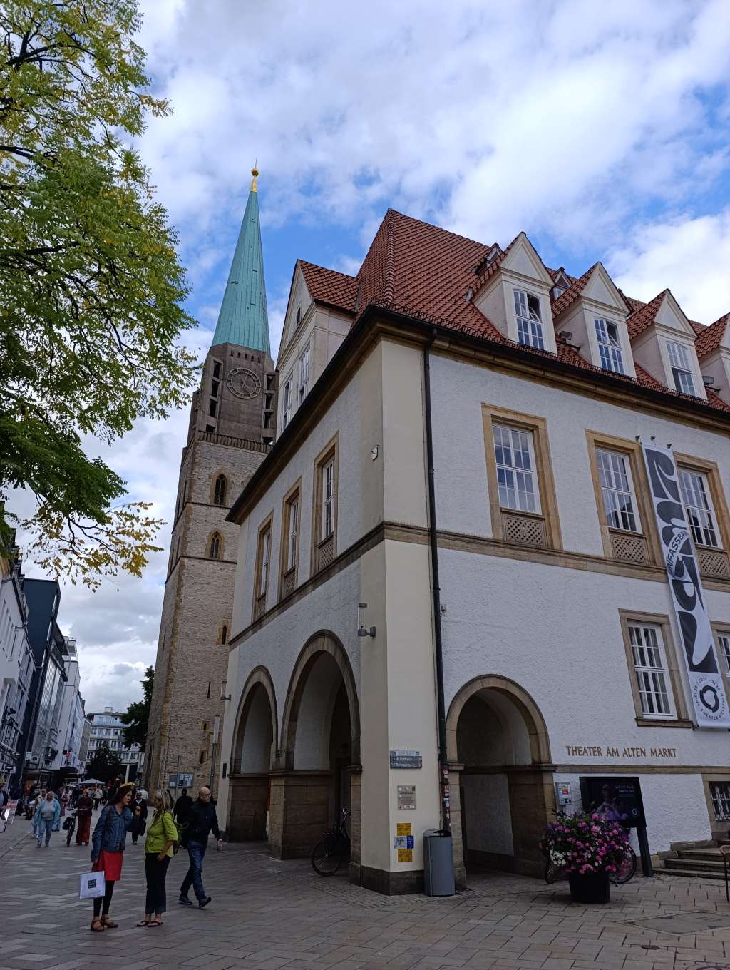 Das Alte Rathaus ist heute ein Theater. Dahinter blitzt die Nicolaikirche, Bielefelds Keimzelle mit Nachkriegs-Betonturm.