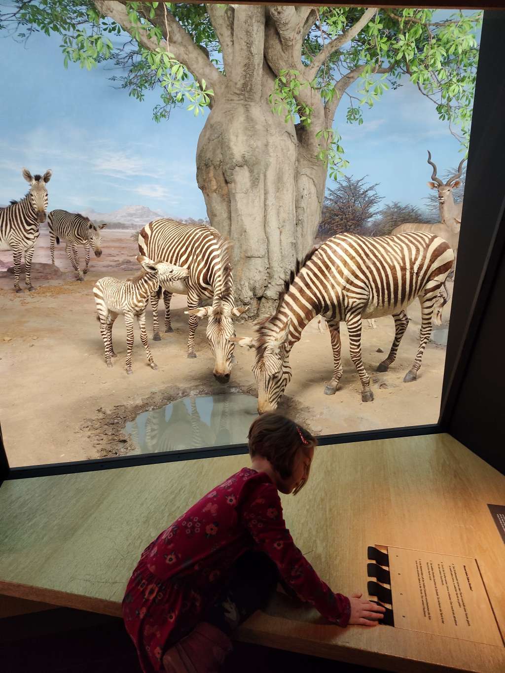 Silas lotst uns zuerst in den nächtlichen Dschungel, der ihn auf dem Weg nach unten schon fasziniert hat. Eigentlich soll man mit den eingebauten Taschenlampen in die dunklen Vitrinen leuchten, aber die sind kaputt. Wie gut, dass sich Handys heutzutage auch zu Taschenlampen umfunktionieren lassen. Auf diese Weise entdecken wir allerhand Tiere und Pflanzen. Diese werden zwar nicht näher erklärt, aber das ist den Jungs egal. Der Entdeckerdrang hat hier Vorrang.