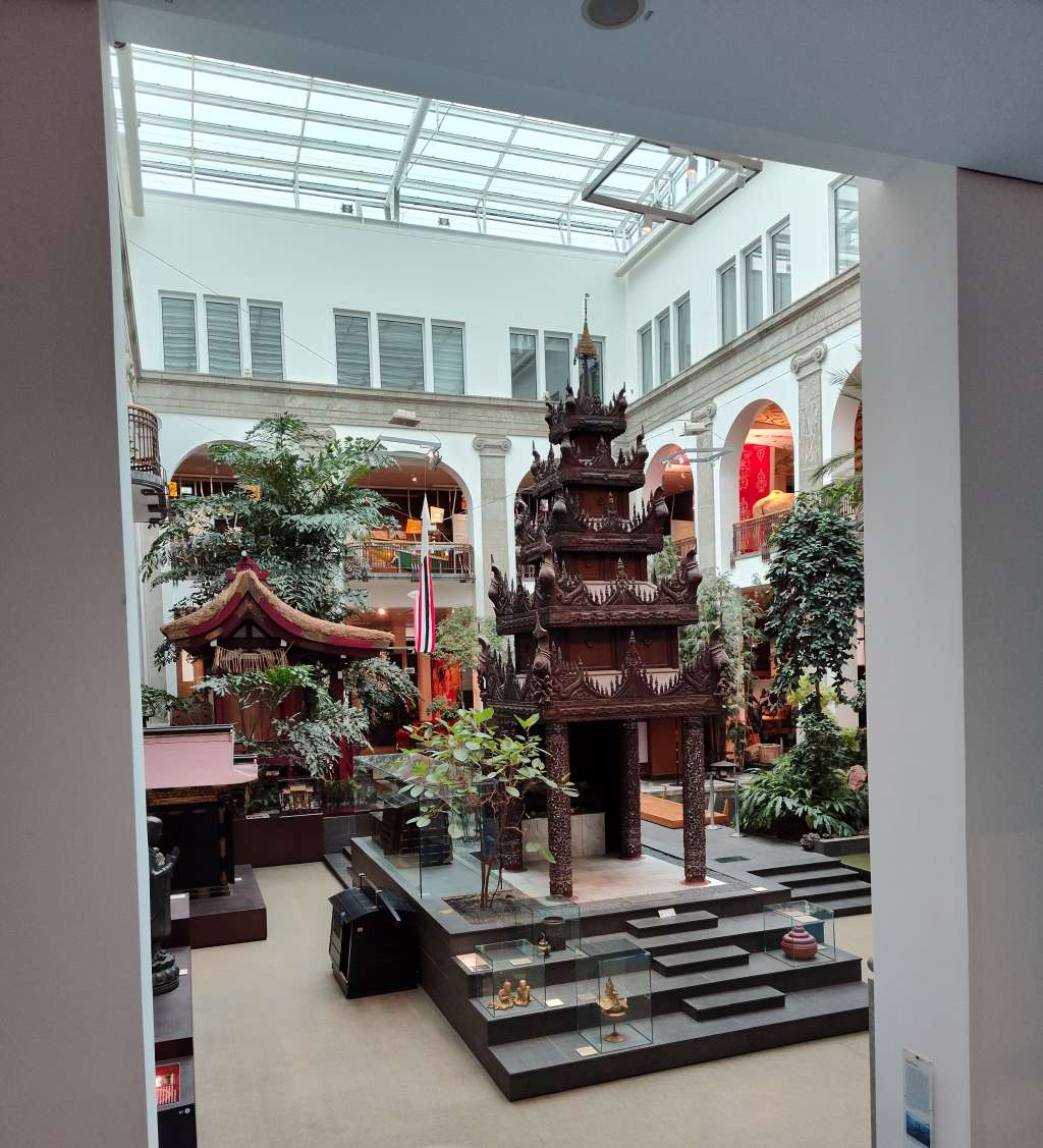Schon beim Betreten der Ausstellungshalle zieht es uns in alle Richtungen gleichzeitig. Da locken Nachbauten fernöstlicher Tempelanlagen, ein sichtlich ausgiebig benutztes Boot von Inselbewohnern aus der Südsee will erkundet werden, und Silas zieht an meinem Handgelenk, weil er auf der Vitrine dahinten einen ausgestopften Pfau entdeckt hat.