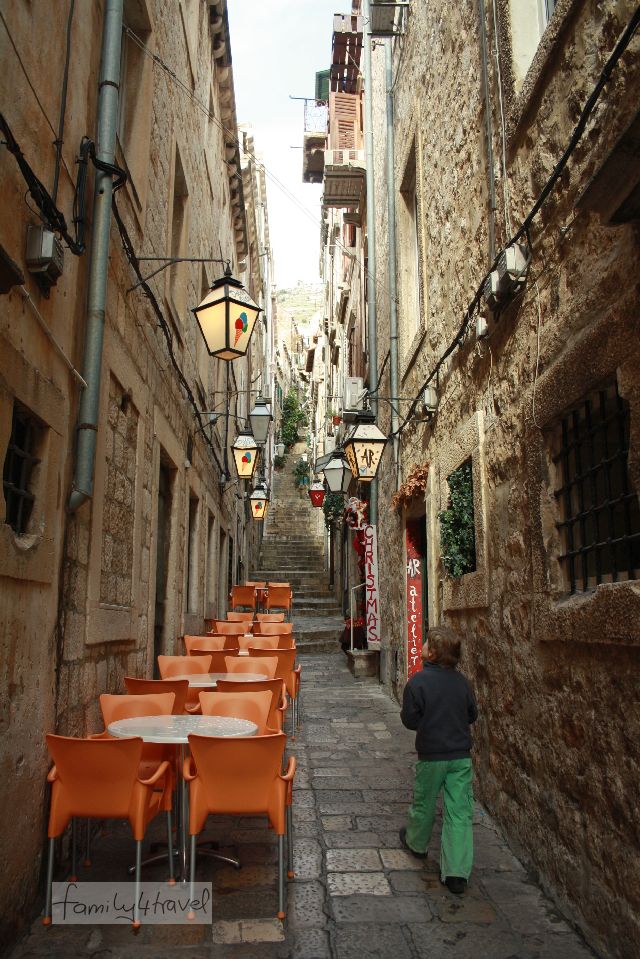 Zwei Tage lang haben wir die Stadt von oben betrachtet (in den kurzen Phasen, die wir nicht im Badezimmer verbrachten). Wir haben eine Ferienwohnung in einem der vielen Häuser gemietet, die sich entlang lächerlich enger Gassen in den Fels krallen. Autofahren können hier nur Einheimische, durch die Haarnadelkurven arbeitet man sich abwechselnd vorwärts und rückwärts (bei der Unterkunftswahl unbedingt Parkplatzsituation erfragen und Kinderwagen zu Hause lassen!). Dafür ist die Aussicht auf Dubrovniks Altstadt und die Adria wirklich fantastisch. Als wir uns endlich auf den Weg nach unten machen, benötigen wir etwa eine Viertelstunde, um die dreistellige Anzahl von Treppenstufen hinabzusteigen.