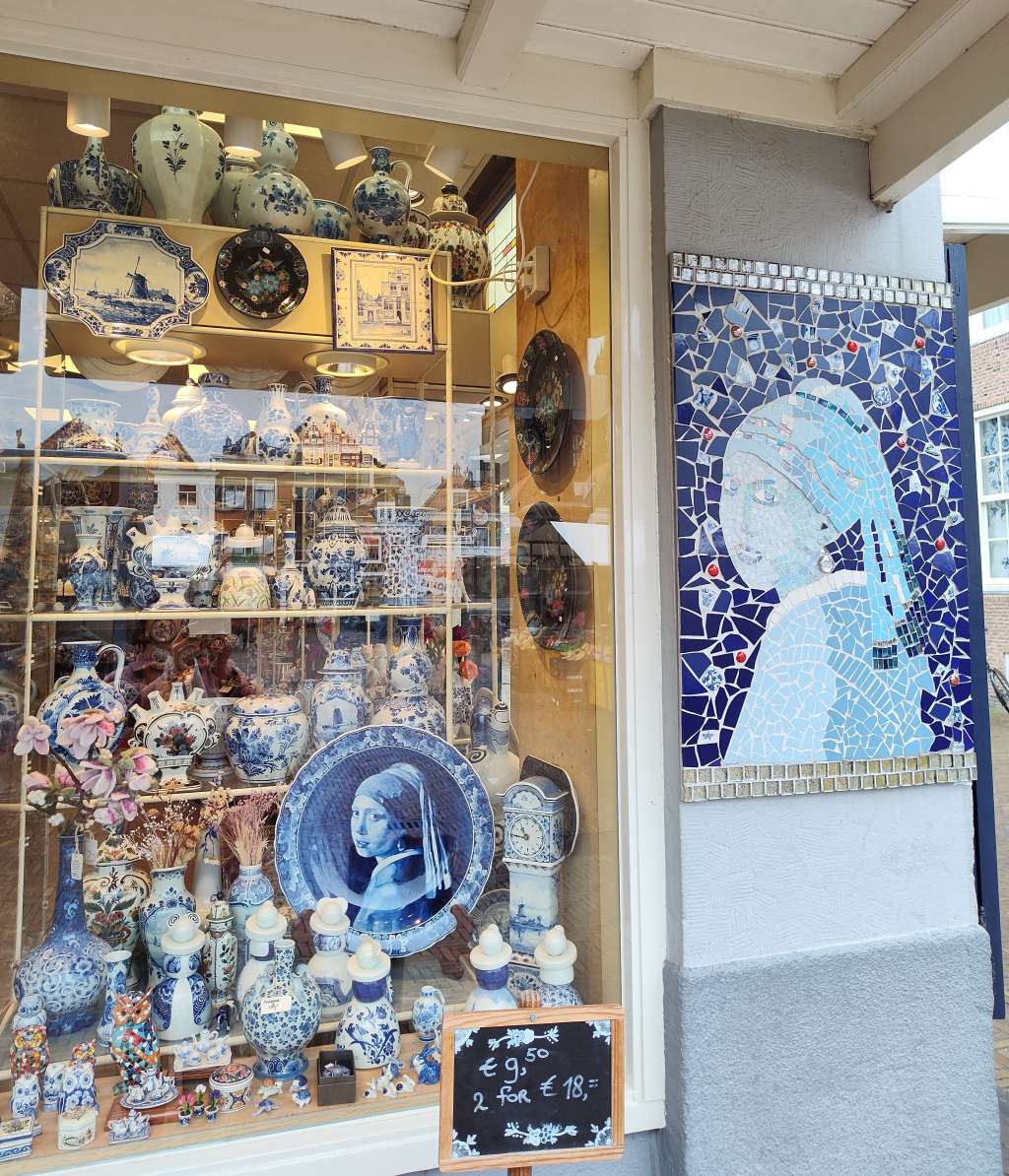 Delfter Kacheln, „Delfter Blau“ und Vermeers „Mädchen mit dem Perlenohrring“ sind in Delft allgegenwärtig. (Souvenirläden auch.)