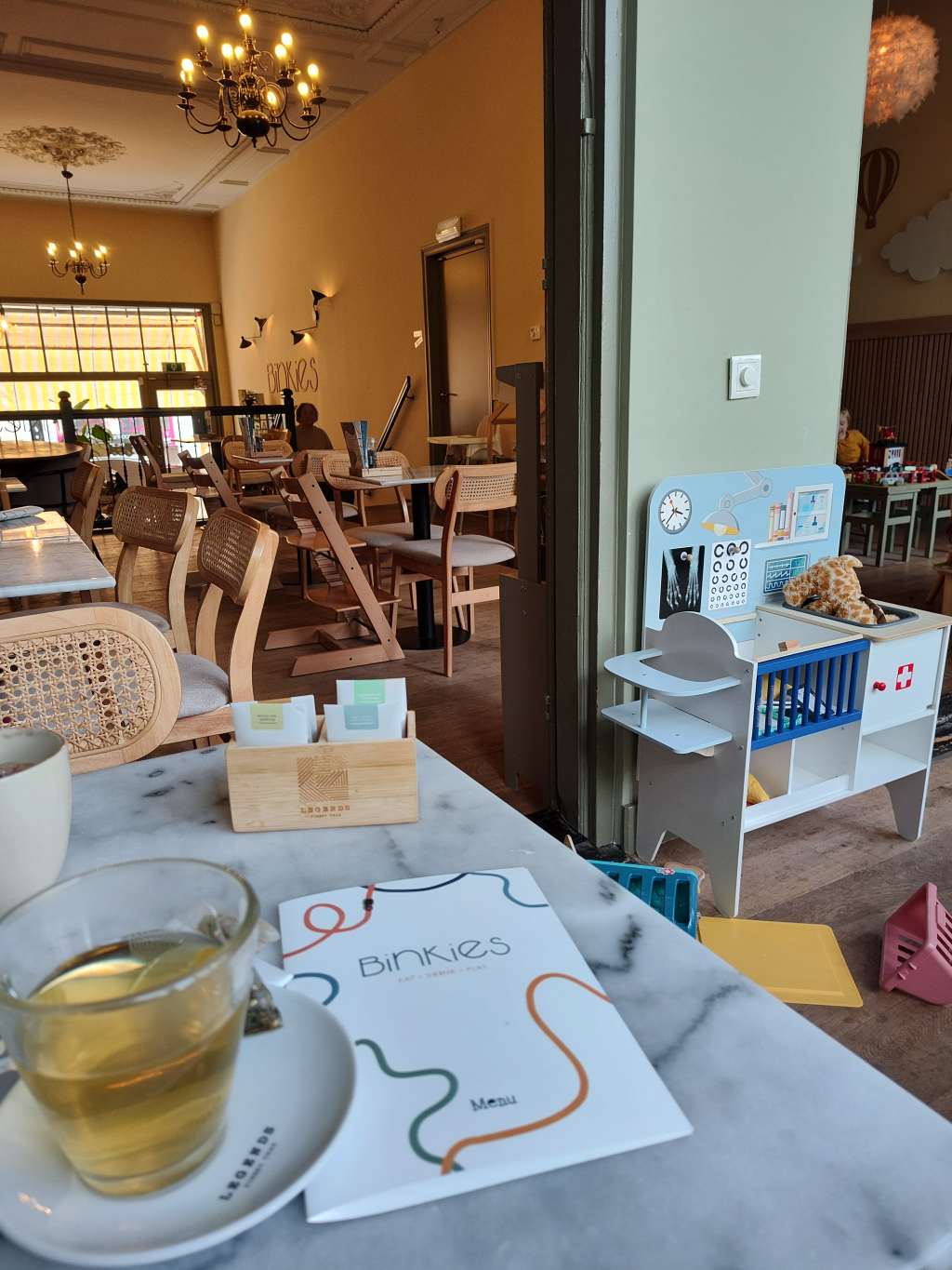 Dann ist uns so kalt, dass wir uns dringend aufwärmen müssen. Zum Glück habe ich einen Tipp für ein tolles Kinder-Café bekommen, das gar nicht so weit weg ist (Javastraat 142). Das Binkies ist so gemütlich und schick eingerichtet, dass auch Eltern sich wohlfühlen. Die wahre Zielgruppe sind aber Kinder. Unten gibt es einen Baby- und Kleinkindbereich bis maximal vier Jahre. Wir machen es uns oben auf der Empore bequem, wo eine große Briobahn, mehrere Puppenhäuser, eine Spielküche und eine Tierarztstation Kinder bis vielleicht acht Jahre glücklich machen.