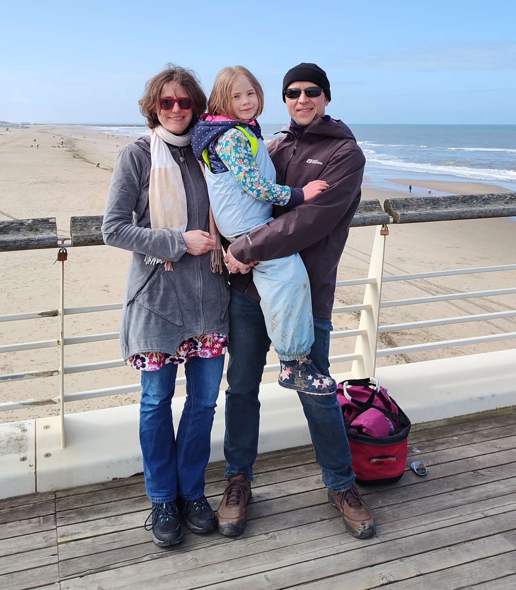 Echte Erfahrungen aus dem Familienurlaub in den Niederlanden, von echten Menschen, ohne KI. Das sind wir: Lena, Franka (6), Martin, in Scheveningen am Strand.