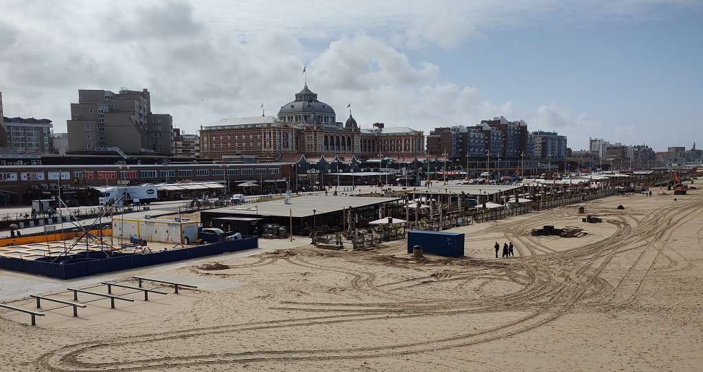 Die Strandpromenade von Scheveningen mit dem Grand Hotel in der Mitte und Strandcafés dicht an dicht.