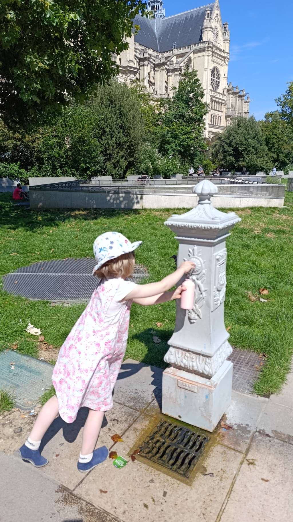 Ein richtiges Park-Foto von dort habe ich gar nicht, aber auch das ist beim Besuch von Paris mit Kindern eine wichtige Info: In jedem Park und auch an etlichen anderen öffentlichen Plätzen gibt es Brunnen mit Trinkwasser. (Und bei näherem Hinsehen ist sehr wohl erkennbar, dass da was drunter ist, bemerke ich gerade.)