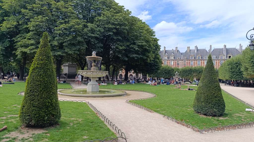 Der Spielplatz am Place des Vosges scheint eine recht neue Errungenschaft zu sein. Ich wollte nachschauen, an welcher Seite er sich befindet, aber bei Google Streetview mit Bildern von 2019 ist er gar nicht drauf. – Ah, am Außenring sind die Bilder neuer: An der Südseite befindet er sich. Wirklich herausragend ist der Spielplatz allerdings nicht. Nahe am Zaun reihen sich mehrere kleine Klettergerüste und andere Spielgeräte sowie eine Rutsche.